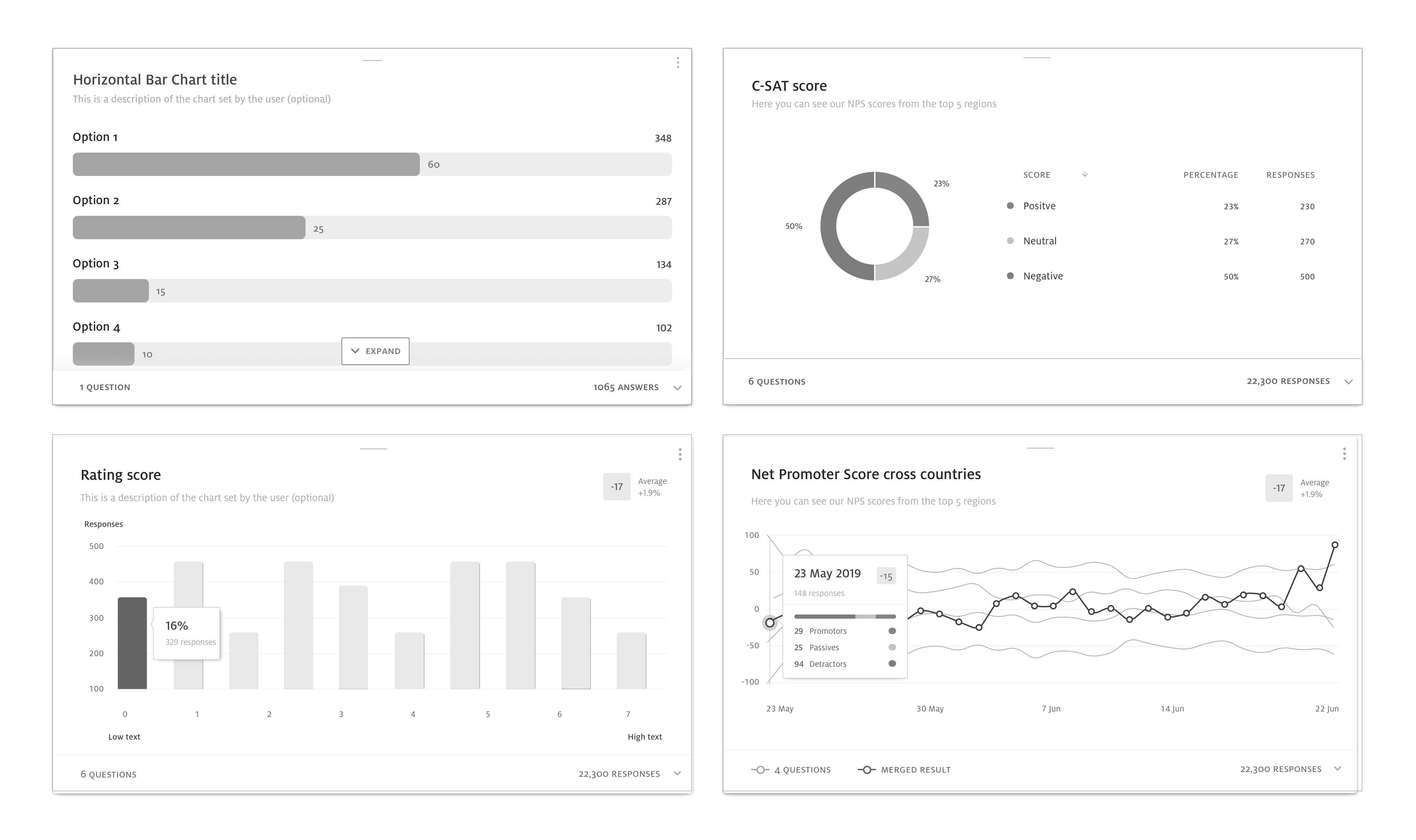 When customers are asking similar questions and different touch-points and tracking multiple KPIs, they want to merge and compare the results to get a better understanding of the feedback and report on the results.Step 1: Name and description. Step 2: Select the tile type (based on the different question type)